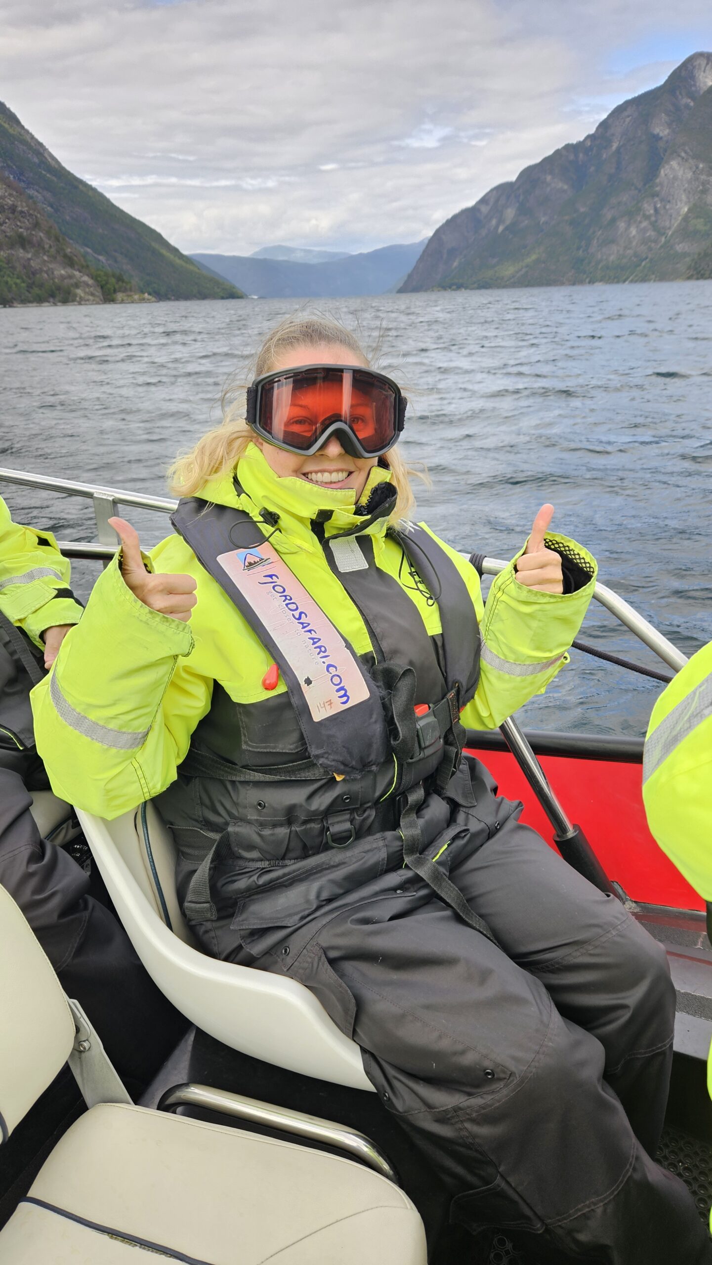 When I arrived in Flåm, the big Fjordsafari tent by the harbour was impossible to miss. About 20 minutes before departure, I checked in and was handed my gear: a full flotation suit, life vest, gloves, hat, and goggles. Wrestling myself into the suit was an adventure in itself, but the friendly Fjordsafari staff were full of helpful tips (and jokes!) to make sure we were comfy, safe, and ready for action.